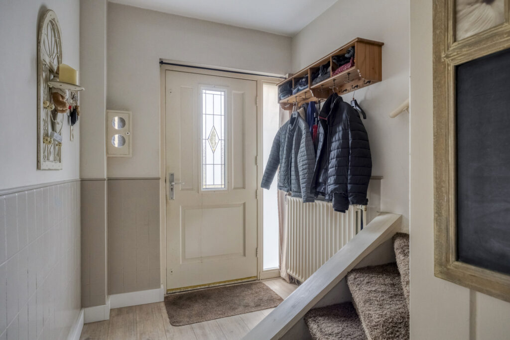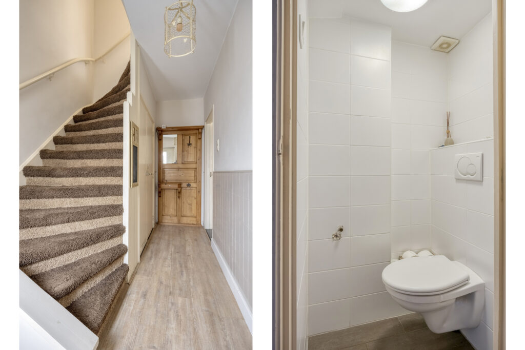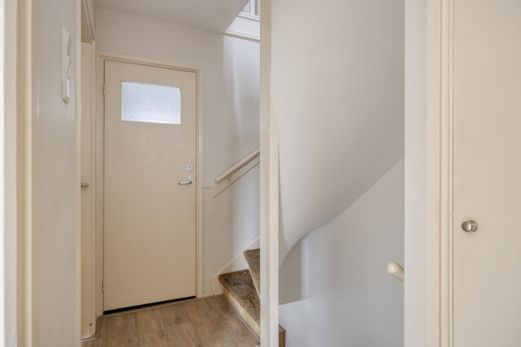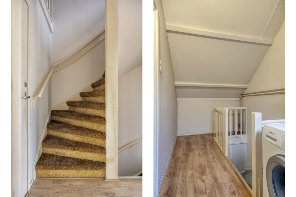 Overloop met vaste kast en trapopgang naar de tweede verdieping met toegang tot: