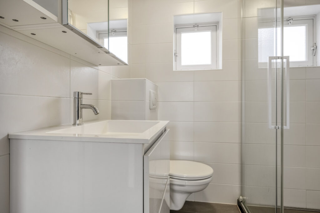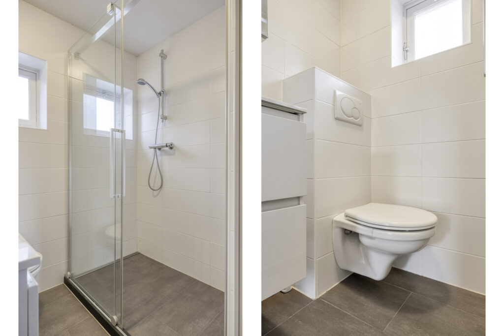 – Badkamer met inoopdouche met glazen spatwand, wastafel in meubel, spiegelkast en tweede toilet.