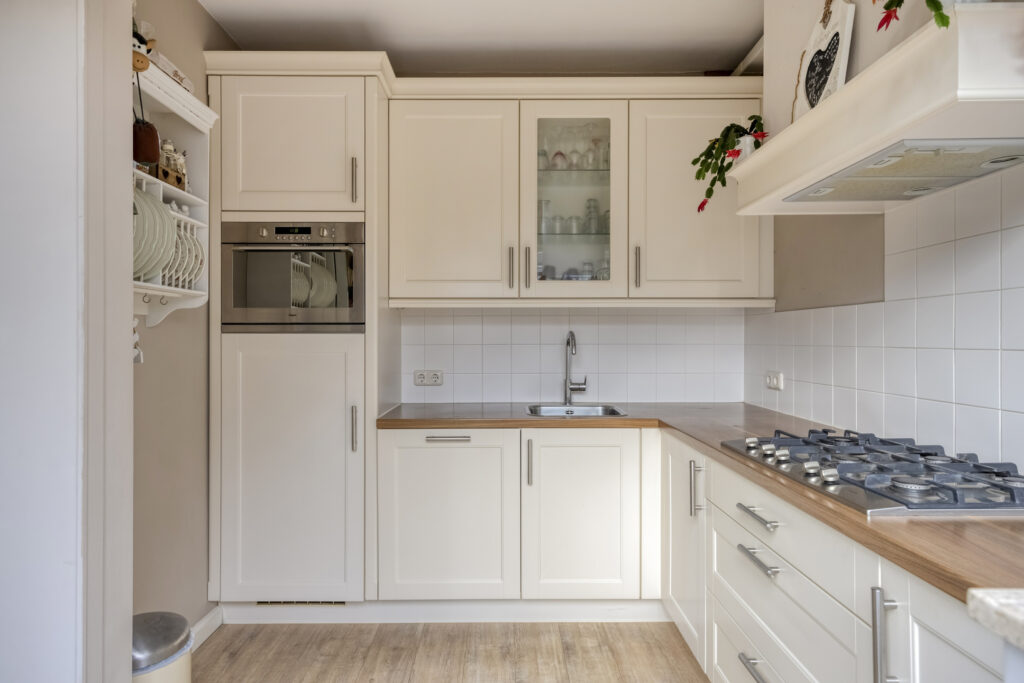 entree/hal met garderobe, trapopgang, volledig betegelde toiletruimte met hangcloset (aansluiting fonteintje aanwezig); verdiepte trapkast met meterkast; woonkamer met sfeervolle Morso houtkachel (ter overname) met doorgang naar de tuin; half-open keuken met inrichting in hoekopstelling met diverse boven- en onderkasten, aan inbouwapparatuur is aanwezig: 5-pits gaskookplaat, afzuigkap, koelkast, combi oven-magnetron en vaatwasser, het warm water in de keuken geschiedt middels een close-in boiler, vanuit de keuken is er tevens toegang tot de tuin.