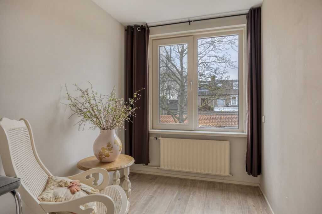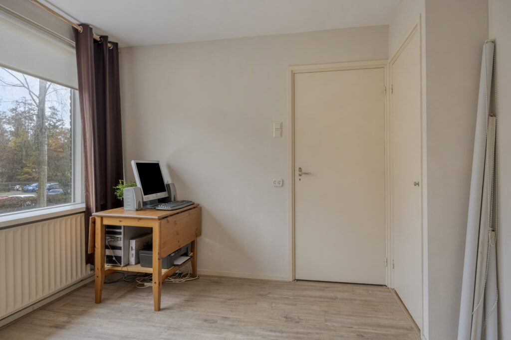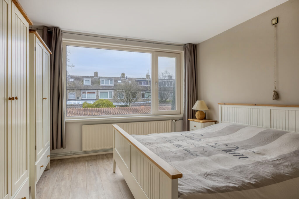 – Slaapkamer 2, gelegen aan de achterzijde met inbouwkast, draai/kiep raam en handbedienbaar zonnescherm;