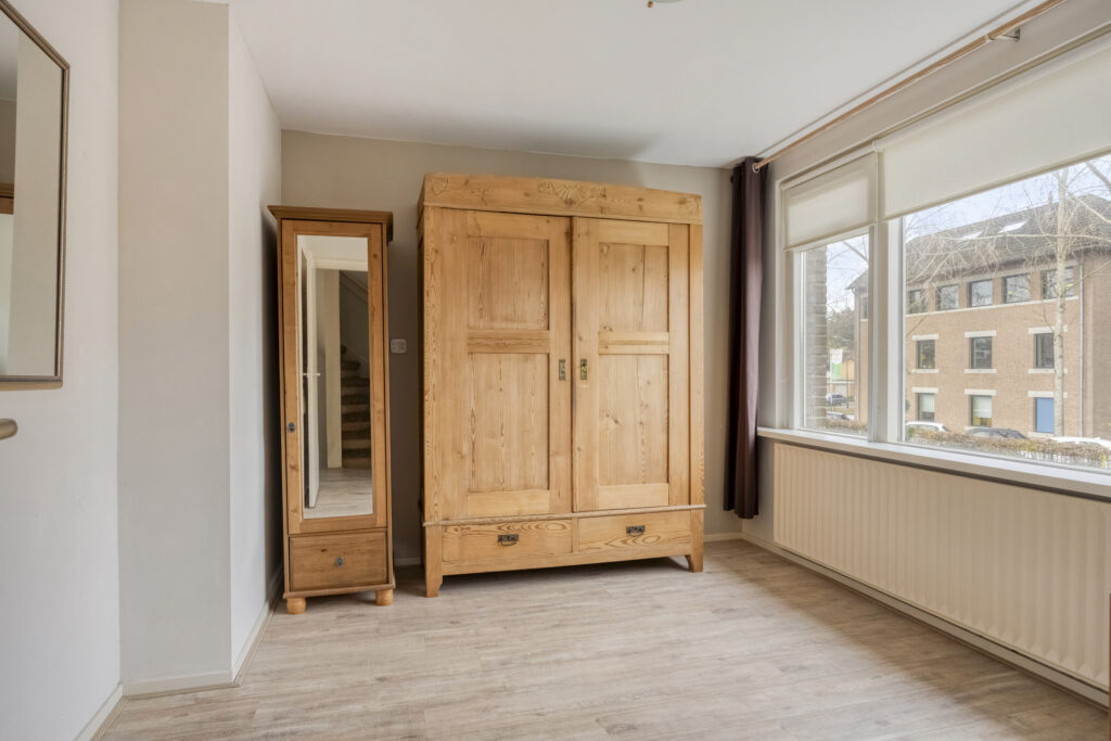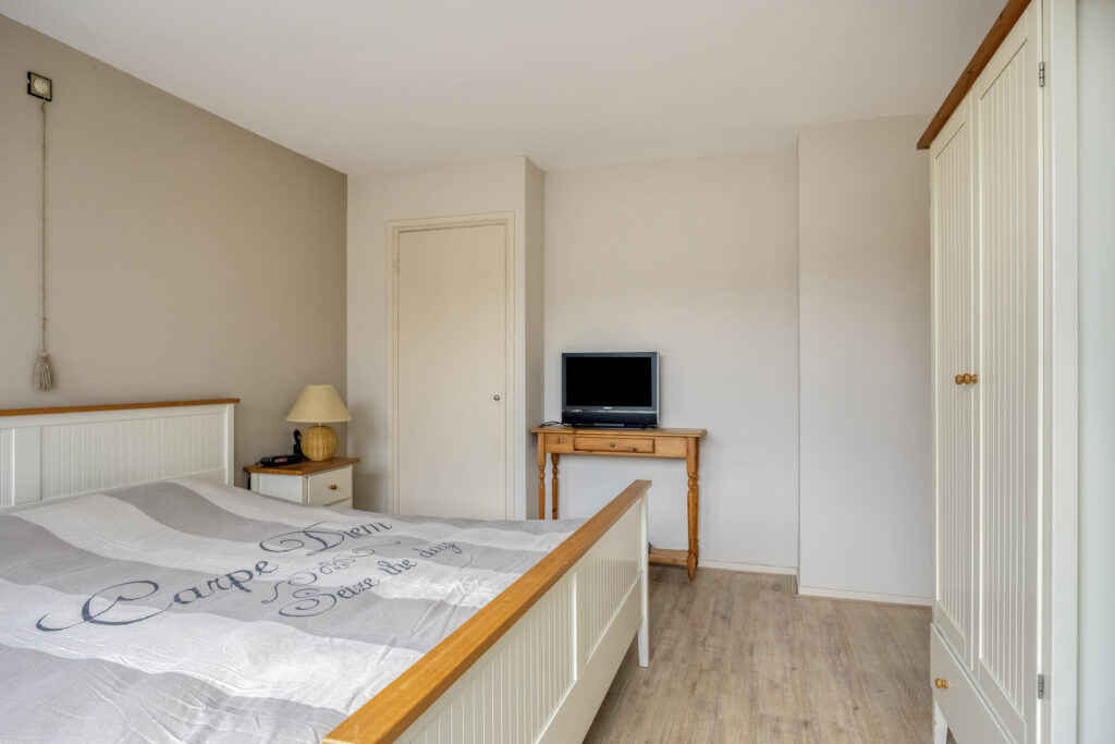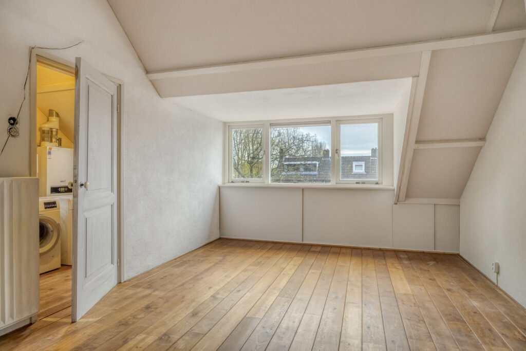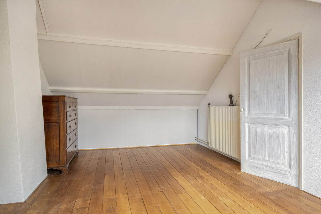 – Slaapkamer 4, grote slaapkamer met houten vloer, dakkapel en veel bergruimte achter de knieschotten.